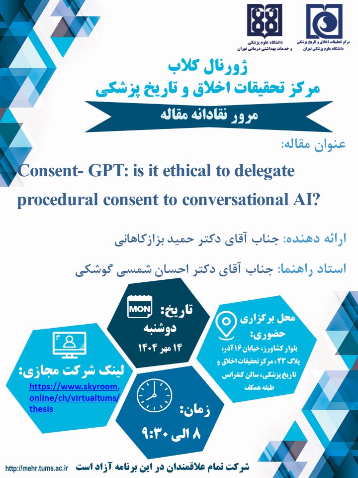 جلسه هفتگی ارائه مقاله ژورنال کلاب اخلاق پزشکی روز دوشنبه 14 مهر ماه 1404 از ساعت 8 تا 9:30 با ارائه دکتر حمید بزازکاهانی و به استاد راهنمایی دکتر احسان شمسی گوشکی، با عنوان مقاله‌ Consent- GPT: is it ethical to delegate procedural consent to conversational AI? در سالن کنفراس طبقه همکف مرکز تحقیقات اخلاق و تاریخ پزشکی و به صورت مجازی در پلتفرم اسکای روم به آدرس https://www.skyroom.online/ch/virtualtums/thesis برگزار می‌‌شود.