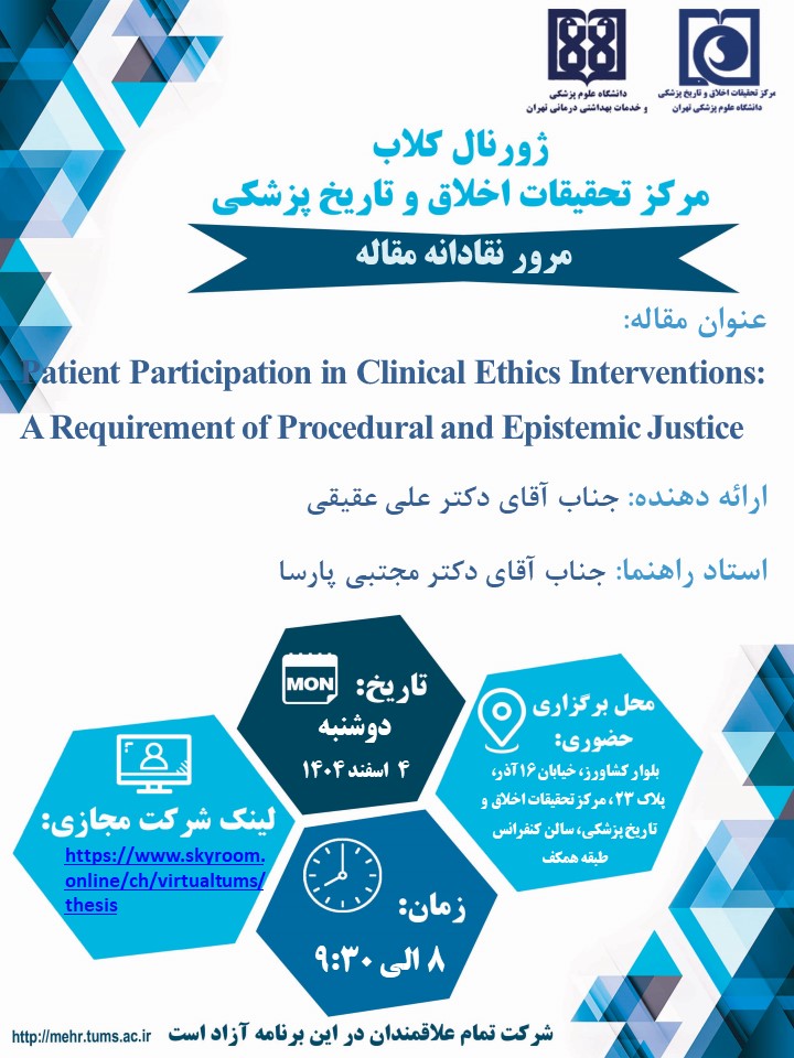 جلسه هفتگی ارائه مقاله ژورنال کلاب اخلاق پزشکی روز دوشنبه 4 اسفند ماه 1404 از ساعت 8 تا 9:30 با ارائه دکتر علی عقیقی و به استاد راهنمایی دکتر مجتبی پارسا، با عنوان مقاله Patient Participation in Clinical Ethics Interventions: A Requirement of Procedural and Epistemic Justice در سالن کنفراس طبقه همکف مرکز تحقیقات اخلاق و تاریخ پزشکی و به صورت مجازی در پلتفرم اسکای روم به آدرس https://www.skyroom.online/ch/virtualtums/thesis برگزار میشود.
