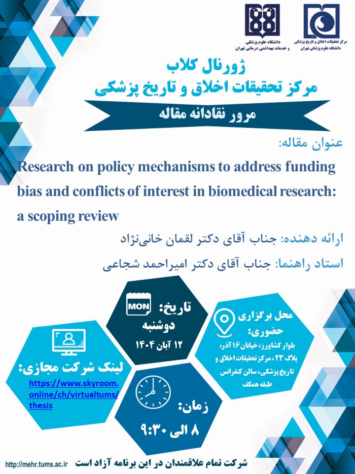 جلسه هفتگی ارائه مقاله ژورنال کلاب اخلاق پزشکی روز دوشنبه 12 آبان ماه 1404 از ساعت 8 تا 9:30 با ارائه دکتر لقمان خانی نژاد و به استاد راهنمایی دکتر امیراحمد شجاعی، با عنوان مقاله‌ Research on policy mechanisms to address funding bias and conflicts of interest in biomedical research: a scoping review در سالن کنفراس طبقه همکف مرکز تحقیقات اخلاق و تاریخ پزشکی و به صورت مجازی در پلتفرم اسکای روم به آدرس https://www.skyroom.online/ch/virtualtums/thesis برگزار می‌‌شود.
